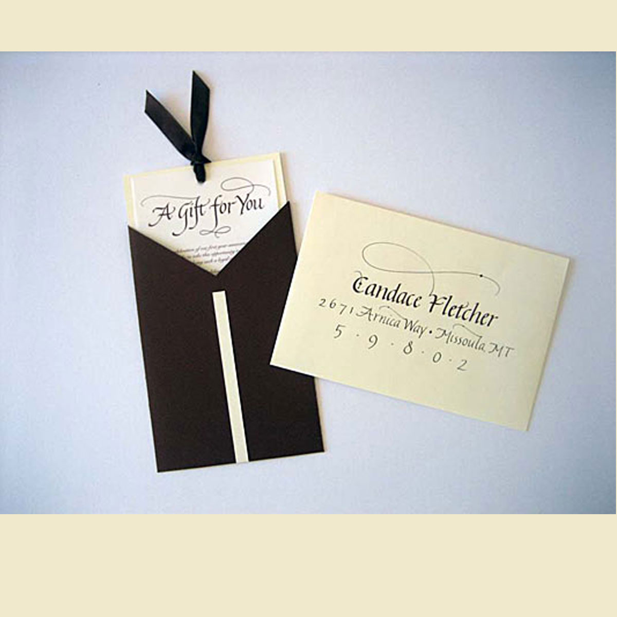 Bozeman, MT | Original artwork; artist books; broadsides including testimonials, posters, certificate design and fill-ins; wedding invitations, addresses, place cards and seating charts; name tags; and more. | |